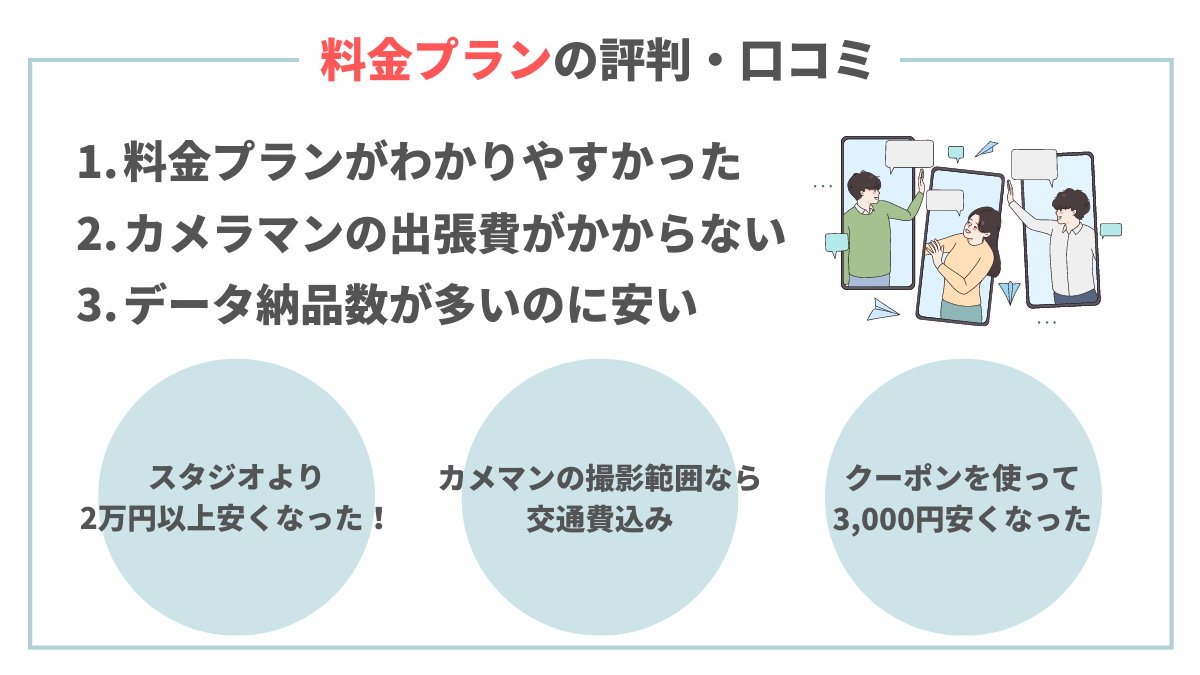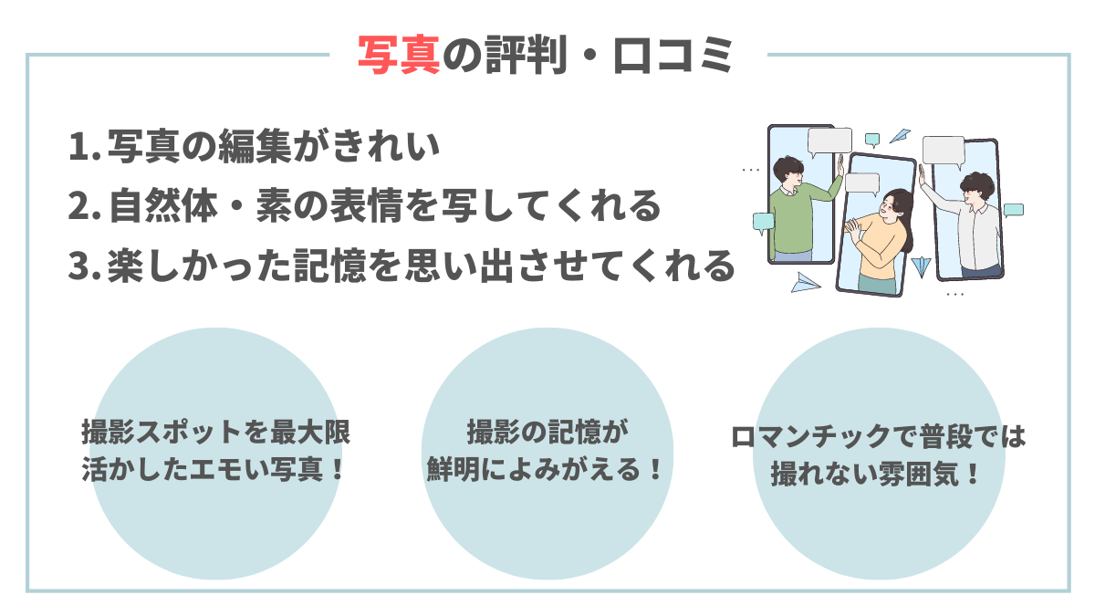 公式サイトには撮影事例や口コミがのってるけど公式を介さない正直なレビューや評判を見たい人も多いはず。